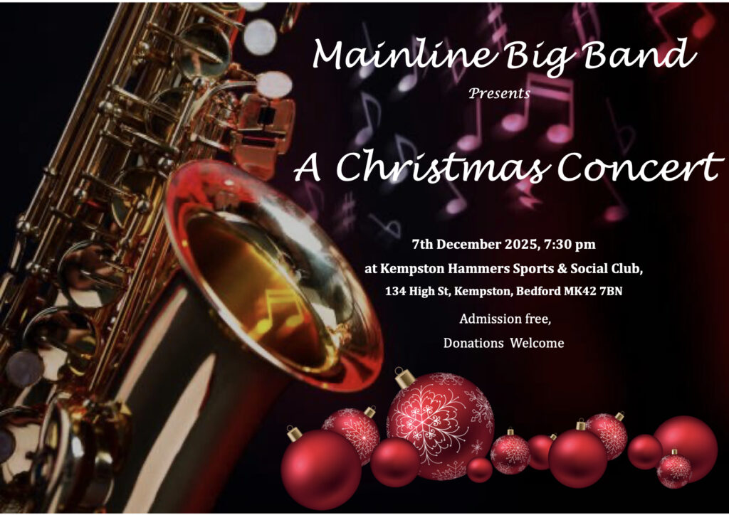 The Mainline Big Band will be performing their annual Christmas Concert for friends and families at Kempston Hammers Sports & Social Club, 134 High Street, Kempston, MK43 7BN on Sunday 7th December, 7pm. Admission is free.